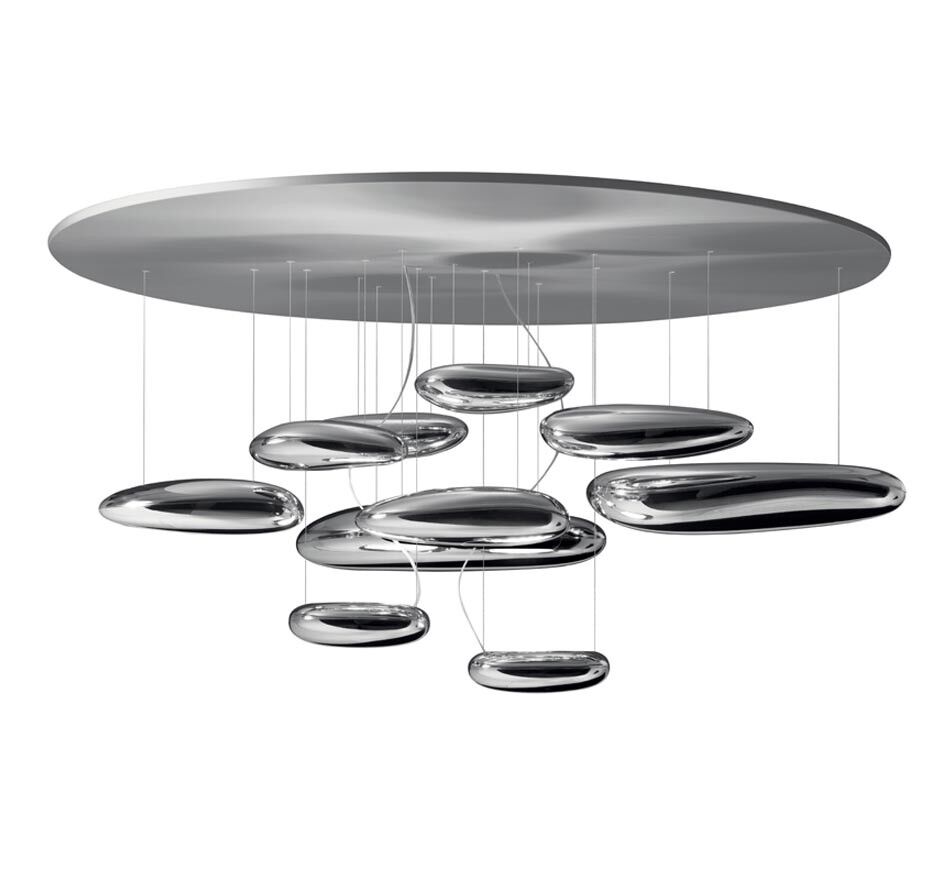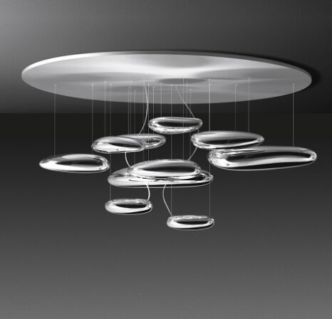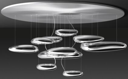 Die Artemide MERCURY Soffitto LED Deckenleuchte gehört zur Produktreihe Hydro, die die Dynamik des Wassers und die Beschaffenheit organischer Flächen zum Vorbild nimmt, um eine optimale Lichtbrechung zu erzielen. Die Deckenleuchte MERCURY besteht aus mehreren großen Lichtsteinen, die an Nylonfäden unter einer ausgesprochen schlichten Aluminiumscheibe zu schweben scheinen. Die Lichtsteine aus Spritzguss-Thermoplast mit reflektierender Metallic-Oberfläche erinnern an zerfließende Tautropfen. Im untersten Lichtstein befindet sich versteckt das Halogen-Leuchtmittel. Dieses wirft das Licht nach oben und fällt auf die anderen Lichtsteine. Diese spiegeln sich gegenseitig und vermitteln den Eindruck eines zwischen den Steinen hin und her fließenden Lichtes, das von den glatten, biomorphen Flächen zurückgeworfen wird. Es entsteht somit eine indirekte und diffuse Lichtstreuung.
