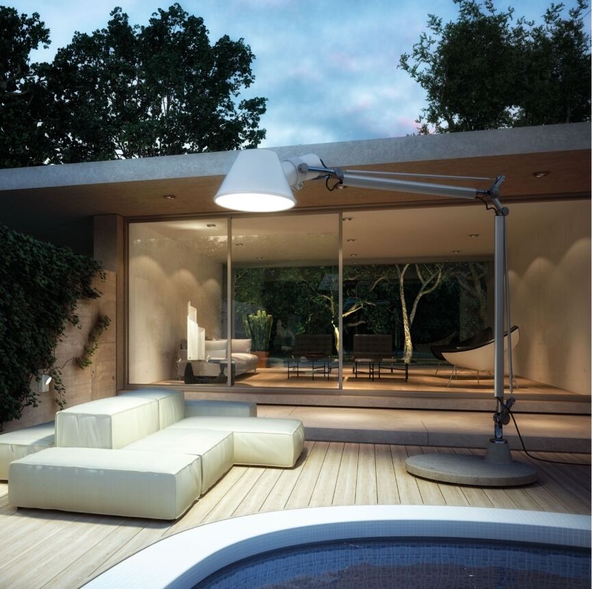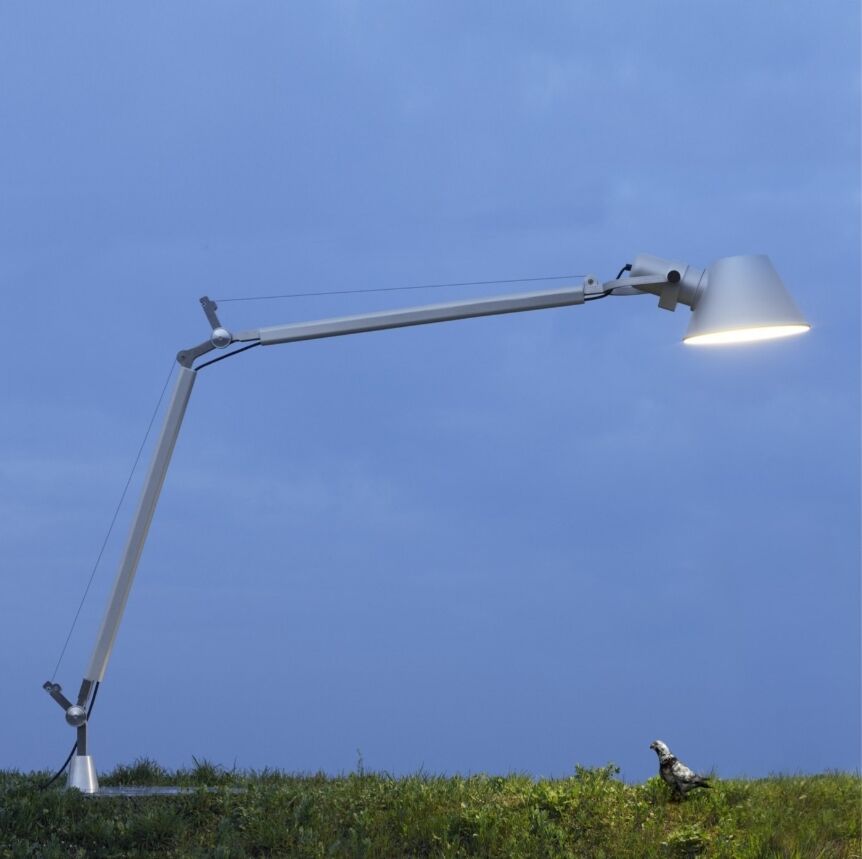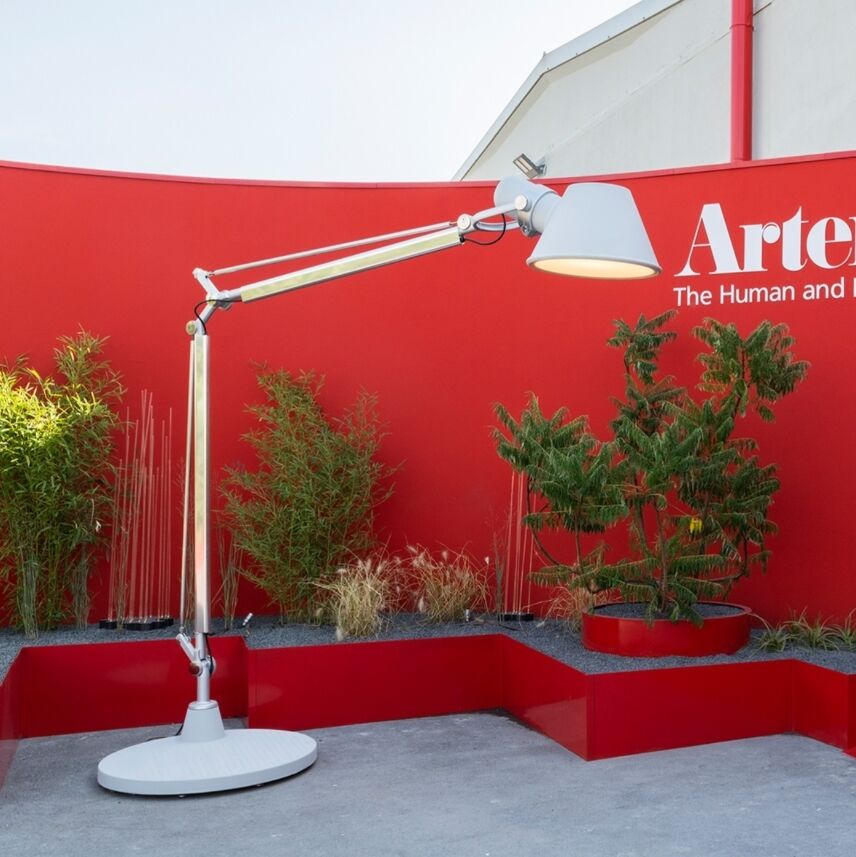 Die ikonische Tischleuchte Tolomeo wurde im Maßstab 4:1 nachgebildet und in ihrer Ausführung und den technischen Lösungen für den Außenbereich (IP65) angepasst. Mit Leuchtenfuß oder fester Halterungen (Pivot) aus durchgefärbtem Beton erhältlich.