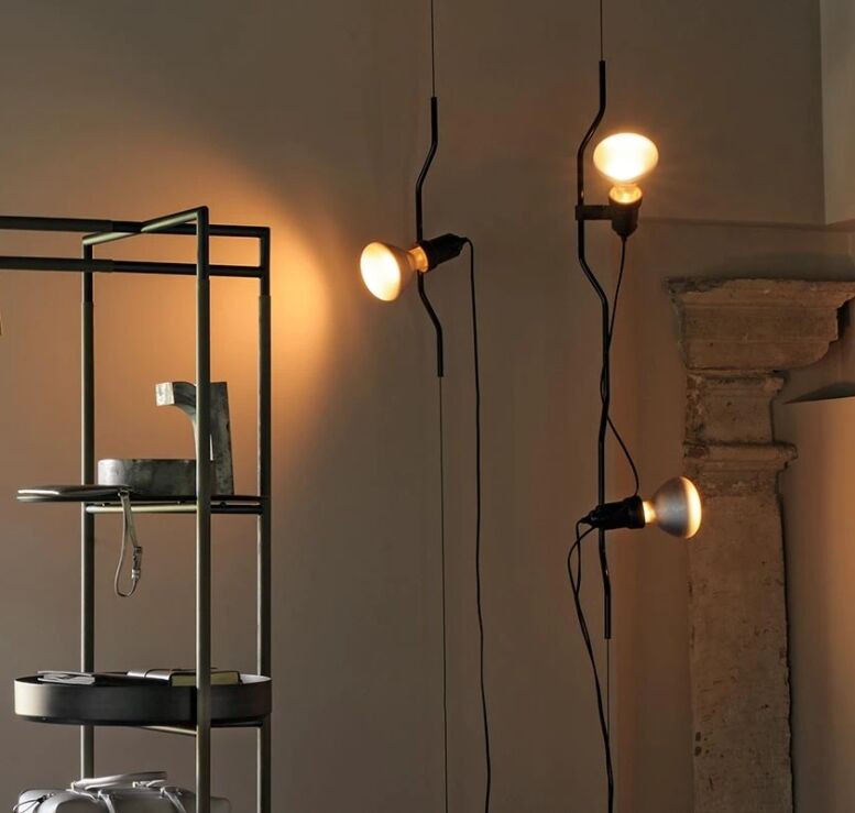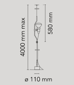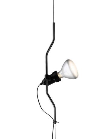 Lampe mit direktem Licht. Vertikale Bewegung der Lampe durch Verschieben eines lackierten oder vernickelten Formstahlrohrs an einem von der Decke bis zum Boden reichenden Stahlseil (4000 mm lang). Leuchtenkopf aus spritzgegossenem schwarzem Elastomer. Am Kabel befindet sich der elektronische Dimmer, der die Regulierung der Lichthelligkeit ermöglicht.