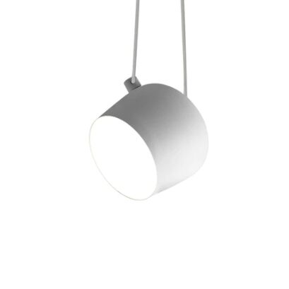 Pendelleuchte. Leuchtenkörper aus gedrehtem, mit Flüssiglack beschichtetem Aluminium, Diffusor aus optischem Polycarbonat mit Fotogravur. Innenreflektor aus fotograviertem ABS. Schwenkbarer Leuchtenkörper. Direkte Netzspeisung. Die LED kann mit einem von Flos anerkannten «Triac für LED» -Dimmer gedimmt werden. Flos haftet nicht im Fall einer falschen Installation von elektrischen Anschlusssystemen. Die Nutzlänge des Kabels beträgt 9 Meter, die Lampe kann daher in einem Abstand von bis zu 3 Metern von der Decke aufgehängt werden. Mehrfachrosette mit Anschlussmöglichkeit von bis zu 5 Aim Leuchten erhältlich.
