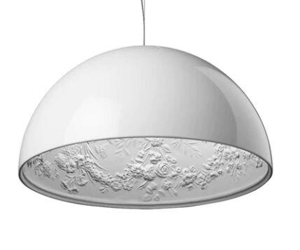 Pendelleuchte für diffuses Licht. Halbkugelförmiger Diffusor aus maschinell bearbeitetem Gipsguss, innen weiß lackiert. Äußeres Finish: Rost, Hochglanzschwarz, Hochglanzweiß oder Mattgold. Diffusorträger aus Gips aus Aluminium-Druckgusslegierung, weiß flüssiglackiert. Geformte obere Buchse aus polierter Aluminium-Druckgusslegierung, auf dem gesamten sichtbaren Teil mit transparentem Lack geschützt. Obere Kabelverschraubung und Überwurfmutter aus schwarzem Spritzguss-PC (Polycarbonat). Geformte, verzinkte Einstellschrauben. Transparente, spritzgegossene, obere und untere Silikon-Stoßdämpfer. Lampenfassung und Halterung aus schwarzem Spritzguss-PPS (Polyphenylensulfid). Diffusor aus geblasenem und geblasenem Opalglas. Geformte Befestigungsringmutter aus Aluminium-Druckgusslegierung mit Alodinbeschichtung. Skygarden 1 Fries aus fotogeätztem und mechanisch gezogenem AISI 304 Stahl.