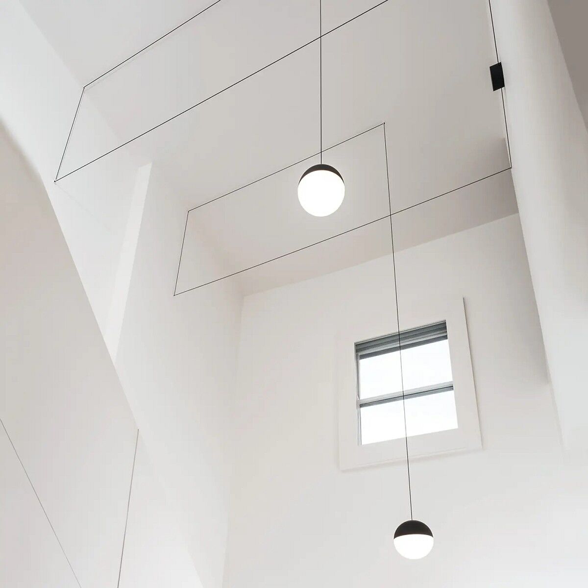 Hängeleuchte mit diffusem Licht. Schwarz, weiß oder blau lackierter Aluminium-Druckgusskörper überzogen mit weichem Klarlack. Optischer Diffusor aus mattem PC. 12 Meter langes Aufhängesystem mit Kevlar-verstärktem Koaxialkabel. Erhältlich mit Wand-/Deckenanschluss in schwarzem PC und Netzteil mit Bodenschalter in schwarz lackiertem