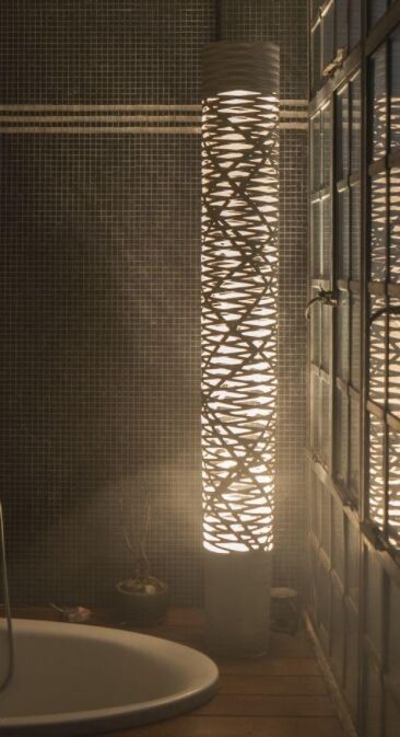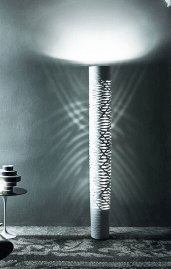 Mit ihrem Geflecht aus Glasfasern und Harz, die sich um ein Band winden, erzeugt die Bodenleuchte Tress ein außergewöhnliches Spiel aus