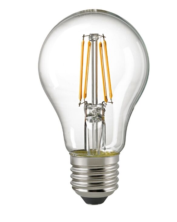 Unsere 4,5W Filament Normallampe ist durch Ihren klassischen Look der optimale Ersatz für Traditionelle Glühlampen. Sie ist mit der modernsten Filamenttechnologie ausgestattet. Ihre Farbwiedergabe mit einem RA-Wert von 90 lässt alles farbgetreu erstrahlen. Durch die Entnahme der Dimmfunktion konnte auf nicht gewünschte Funktionalität verzichtet und somit noch preisattraktiver angeboten werden. Das Lumenpaket unserer Filament lässt sich mit einer 40W herkömmlichen Glühlampe vergleichen. Ihr klarer Glaskolben legt den Blick frei auf die ausgereifte Technik des Leuchtmittels.